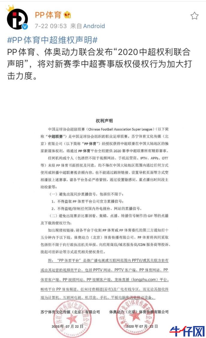 7月22日,PP體育、體奧動力聯合發布“2020中超權利聯合聲明”:任何機構或個人未經PP體育書面授權及同意,均不得在中國大陸地區范圍內通過任何方式使用或轉播中超聯賽視音頻內容,也不能通過跳轉鏈接、設置導航頁面等方式變相播放上述賽事。如出現侵權行為,體奧動力、PP體育將共同采取包括但不限于向行政執法機關舉報、向應用商店/域名服務商/CDN服務商等投訴、提起司法訴訟等方式追究相關侵權責任。