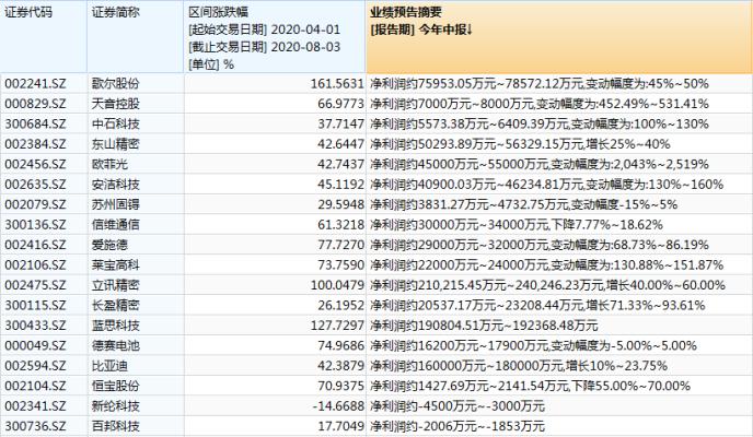 除6家已發布中報業績的蘋果產業鏈公司外,還有18家公司發布了2020年中報預告,業績預喜占75%。其中立訊精密(行情002475,診股)、藍思科技(行情300433,診股)、歌爾股份(行情002241,診股)預計實現凈利潤數額位列蘋果產業鏈賺錢公司前三甲。對應公司股價,二季度以來歌爾股份、立訊精密、藍思科技股價均已翻倍,龍頭強勢延續的基礎便是蘋果銷量大增對相關公司業績提振的預期。從變動幅度來說,歐菲光(行情002456,診股)凈利潤同比增幅20倍以上,天音控股(行情000829,診股)凈利潤同比增幅近5倍,中石科技(行情300684,診股)、安潔科技(行情002635,診股)、萊寶高科(行情002106,診股)凈利潤同比增幅均超1倍。