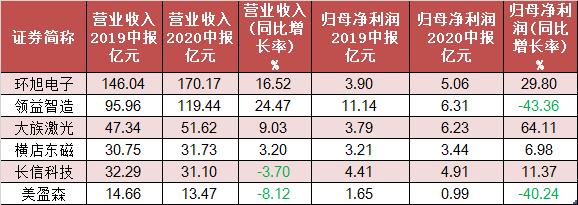下游銷量火爆,直接提振蘋果相關供應商業績表現。Wind數據顯示,截至8月3日,環旭電子(行情601231,診股)、長信科技(行情300088,診股)、橫店東磁(行情002056,診股)、大族激光(行情002008,診股)、領益智造(行情002600,診股)以及美盈森(行情002303,診股)6家公司已發布2020年中報業績(如表1)。可以看到,大族激光、環旭電子歸母凈利潤大幅增長,均受益于消費類電子業務需求好于預期,產品訂單較去年同期保持穩定增長。