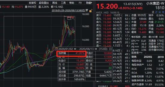 wind數據顯示,今年以來,小米已經漲超40%,市值達到3664億港元(約合人民幣3283億元)。