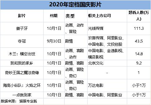 另一部春節檔影片《奪冠》也定于9月30日上映,貓眼最新想看人數超40萬。該片原名《中國女排》,出品方涉及歡喜傳媒、阿里影業、中國電影、文投控股(行情600715,診股)等多家上市公司。