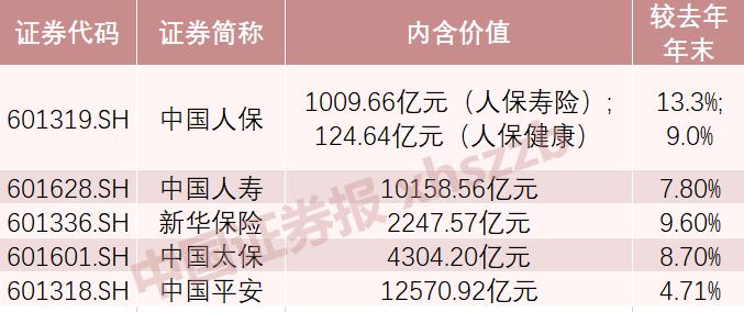 衡量保險股潛力的另一大指標——內含價值方面,五大險企均實現增長。截至上半年末,中國人壽內含價值首次超過萬億元大關,達10158.56億元,較上年末增長7.8%。新華保險(行情601336,診股)內含價值達到2247.57億元,較上年末增長9.6%。中國太保內含價值4304.20億元,較上年末增長8.7%。人保壽險內含價值1009.66億元,較上年末增長13.3%,人保健康內含價值124.64億元,較上年末增長9.0%。中國平安集團內含價值12570.92億元,較上年末增長4.71%。