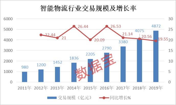 根據(jù)網(wǎng)經(jīng)社發(fā)布的《2019年度中國(guó)物流科技行業(yè)數(shù)據(jù)報(bào)告》顯示,中國(guó)已成為全球第一快遞大國(guó),物流朝著多元化、智能化、開(kāi)放化、國(guó)際化方向發(fā)展。2019年,智能物流市場(chǎng)規(guī)模約為4872億元,同比2018年的4075億元增加了19.55%。與以往幾年的同比增長(zhǎng)幅度相比,處于低位。如果按照這個(gè)增長(zhǎng)幅度保守估計(jì),預(yù)計(jì)2020年智能物流交易規(guī)模將超5800億。