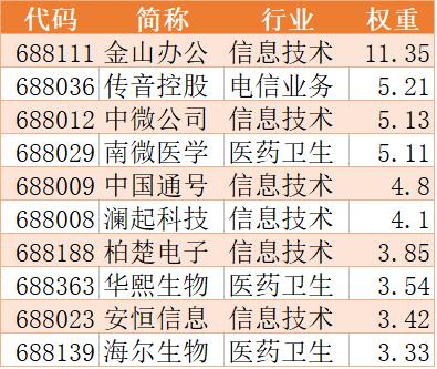 具體個股上看,科創(chuàng)50前10大權重股中,金山辦公(行情688111,診股)權重超過了10%,排名第一;傳音控股(行情688036,診股)、中微公司(行情688012,診股)、南微醫(yī)學(行情688029,診股)權重超過了5%,此外還有中國通號(行情688009,診股)、瀾起科技(行情688008,診股)、柏楚電子(行情688188,診股)、華熙生物(行情688363,診股)、安恒信息(行情688023,診股)、海爾生物(行情688139,診股)等權重超過了3%。