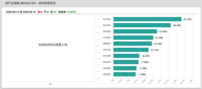 Wind數(shù)據(jù)顯示,雞產(chǎn)業(yè)指數(shù)上周(9月7日-9月11日)累計(jì)下跌9.33%,本月累計(jì)下跌12.12%,年初至今跌逾10%。