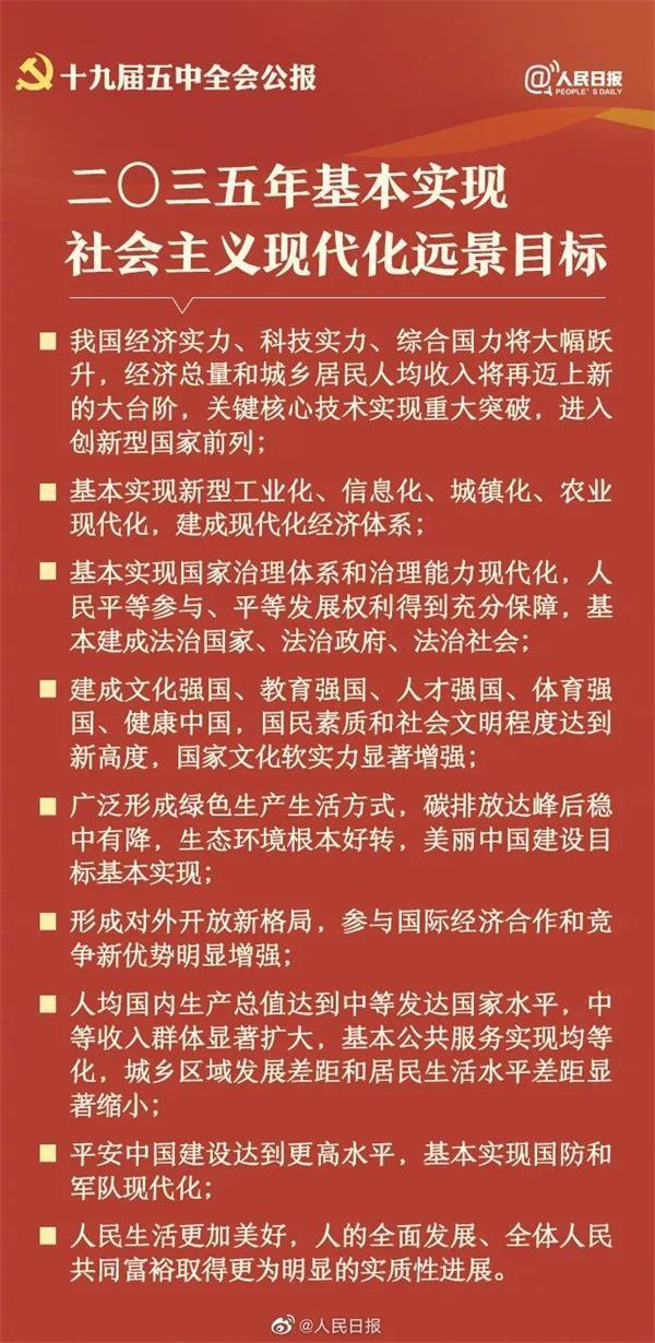 據新華社報道,在本次會議上,提出了到二〇三五年基本實現社會主義現代化遠景目標,這就是:我國經濟實力、科技實力、綜合國力將大幅躍升,經濟總量和城鄉居民人均收入將再邁上新的大臺階,關鍵核心技術實現重大突破,進入創新型國家前列;基本實現新型工業化、信息化、城鎮化、農業現代化,建成現代化經濟體系;基本實現國家治理體系和治理能力現代化,人民平等參與、平等發展權利得到充分保障,基本建成法治國家、法治政府、法治社會;建成文化強國、教育強國、人才強國、體育強國、健康中國,國民素質和社會文明程度達到新高度,國家文化軟實力顯著增強;廣泛形成綠色生產生活方式,碳排放達峰后穩中有降,生態環境根本好轉,美麗中國建設目標基本實現;形成對外開放新格局,參與國際經濟合作和競爭新優勢明顯增強;人均國內生產總值達到中等發達國家水平,中等收入群體顯著擴大,基本公共服務實現均等化,城鄉區域發展差距和居民生活水平差距顯著縮小;平安中國建設達到更高水平,基本實現國防和軍隊現代化;人民生活更加美好,人的全面發展、全體人民共同富裕取得更為明顯的實質性進展。