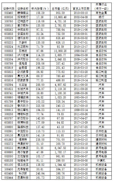 此外,萬華化學(xué)(行情600309,診股)、招商銀行(行情600036,診股)、華魯恒升(行情600426,診股)、法拉電子(行情600563,診股)、通威股份(行情600438,診股)、三花智控(行情002050,診股)、中航光電(行情002179,診股)、愛爾眼科(行情300015,診股)、億緯鋰能(行情300014,診股)、洋河股份(行情002304,診股)、中科電氣(行情300035,診股)、新宙邦(行情300037,診股)、偉星新材(行情002372,診股)、??低?行情002415,診股)、杭氧股份(行情002430,診股)、巨星科技(行情002444,診股)、贛鋒鋰業(yè)(行情002460,診股)、晶澳科技(行情002459,診股)、匯川技術(shù)(行情300124,診股)等19家上市時間也是超過10年的公司。