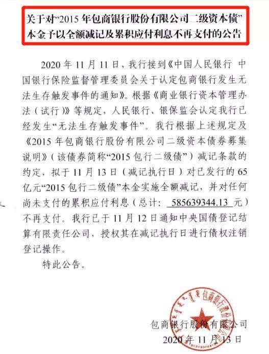11月13日,包商銀行在中國貨幣網發布公告稱,該行擬于11月13日對已發行的65億元“2015包行二級債”本金實施全額減記,并對任何尚未支付的累積應付利息(總計:585639344.13元)不再支付,包商銀行已于11月12日通知中央國債登記結算有限公司,授權其在減記執行日進行債權注銷登記操作。